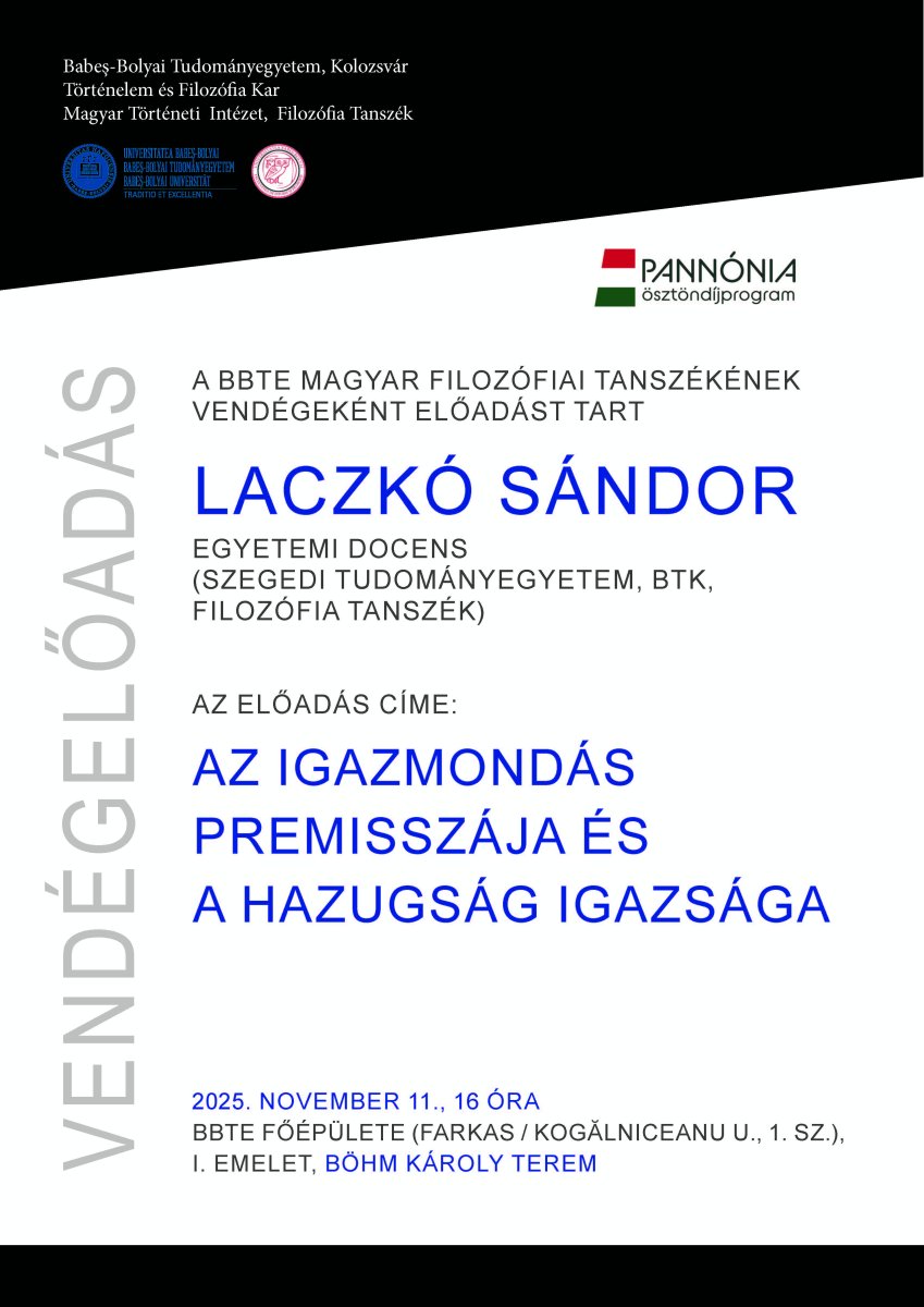 November 11-én, kedden 16 órától dr. Laczkó Sándor egyetemi docens (Szegedi Tudományegyetem, BTK, Filozófia Tanszék) tart vendégelőadást.